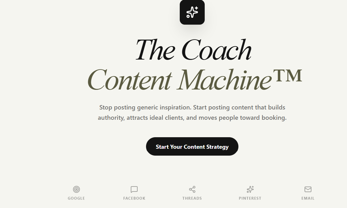 The Coach Content Machine™ takes your actual offer, your brand voice, and your methodology...and builds a full week of content across Google Business Profile, Facebook, Threads, Pinterest, and email subject lines. Content that names the exact problem your client is lying in bed thinking about at midnight. Content that builds the kind of trust that makes someone DM you saying "I don't know how but I feel like you wrote this for me."